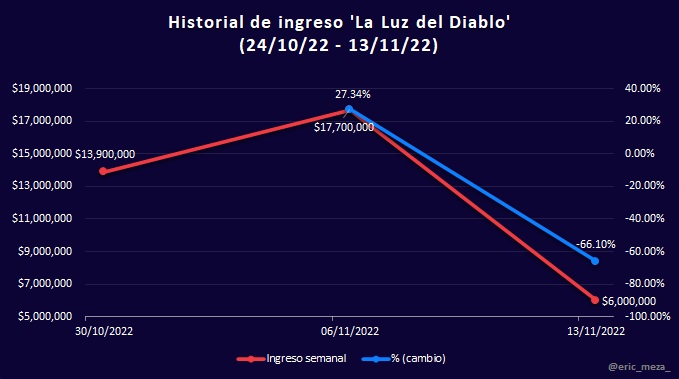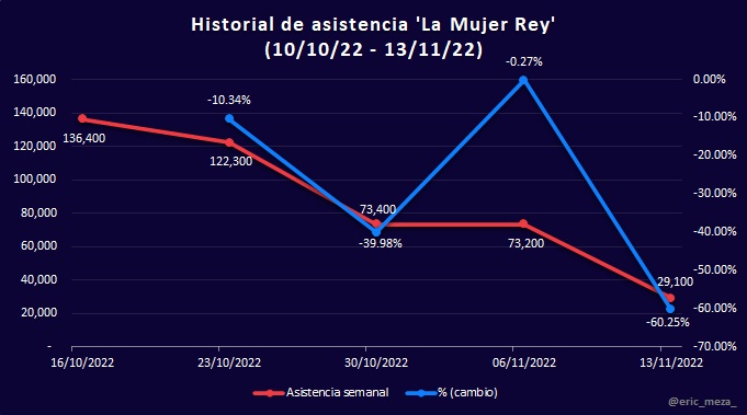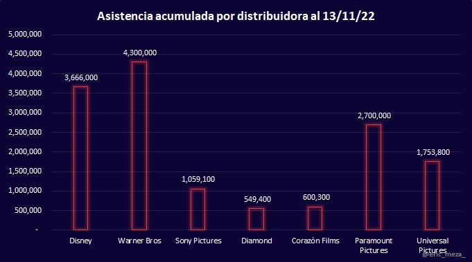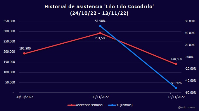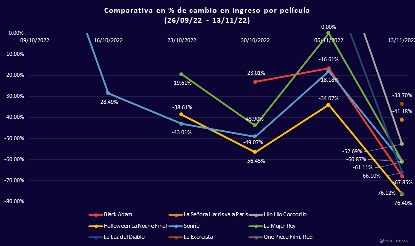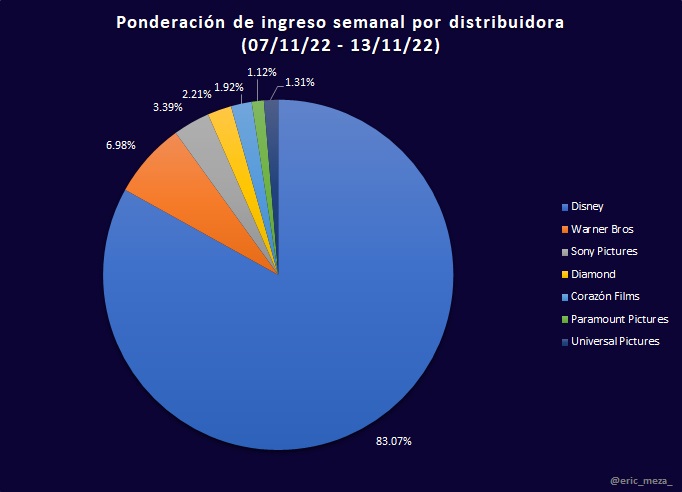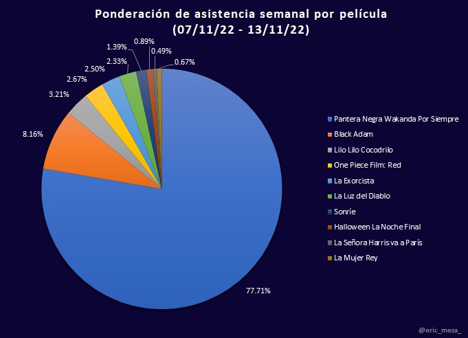 Sin embargo, la nueva película de Disney permite visualizar la situación actual de exhibición en México. Si bien estos últimos días el ingreso en taquilla fue significativamente mayor por dicho estreno, para el resto de las películas el porcentaje de cambio en taquilla disminuyó hasta un 76%, consecuencia de que una sola película, Black Panther: Wakanda Forever, acaparó las salas.
