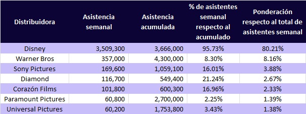 En distribuidoras esta semana resaltaron siete. Liderando la taquilla está Disney con $259 millones 500 mil, cifra correspondiente al 83.07% del total del top. Y en último lugar tenemos nuevamente a Paramount Pictures con $3 millones 500 mil, cantidad que representa el 1.12% del listado.