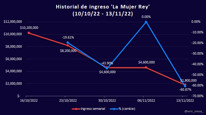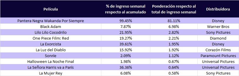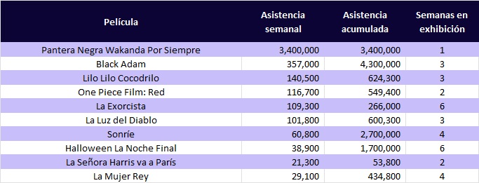Black Panther: Wakanda Forever obtuvo el primer lugar en taquilla con $253 millones 400 mil, cifra correspondiente al 81.11% del total del top 10. Por el contrario, la película con menor recaudación del top fue La Mujer Rey, con $1 millón 800 mil, que representa el 0.58%.