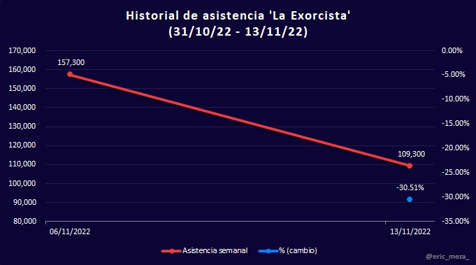 En el caso de la asistencia está igualmente La Exorcista, que en este rubro también tuvo el mayor porcentaje de cambio, aunque igualmente es negativo, -30.51%. Aun con ello, es también el mejor índice del top 10.