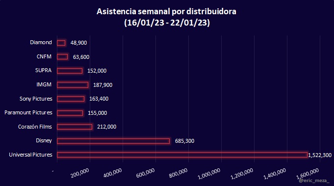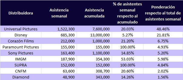 Nuevamente, en asistencia se ubica Universal Pictures con 1 millón 522,300 asistentes, cantidad que representa el 48.46% del total del top. Y en último lugar está Diamond con 48,900, el decir, el 1.56%.