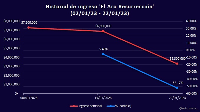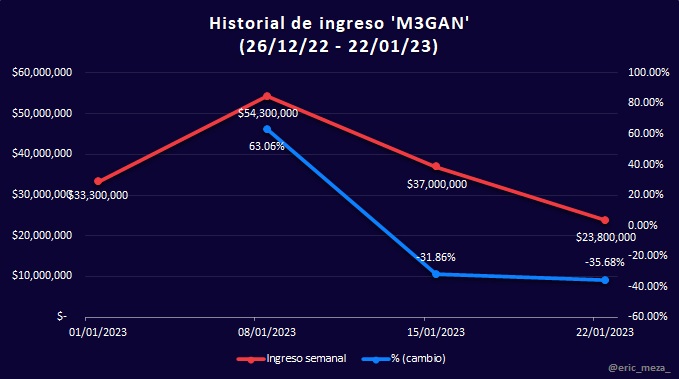 Esta semana disminuyó el ingreso en taquilla respecto a la anterior, consecuencia de la caída en recaudación de todas las películas del top y la escasez de estrenos de alto perfil. De seis estrenos en la semana, solamente aparecen dos estrenos en el top: Babylon en quinto lugar y The Jack in the Box 2: El despertar en octavo. Como ya mencioné en semanas anteriores, el lanzamiento que promete revivir la taquilla es Ant-Man and The Wasp: Quantumania, a estrenarse el 16 de febrero.