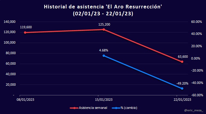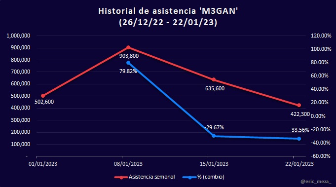 Por último, se muestran las gráficas comparativas en porcentaje de cambio en ingreso y asistencia por película del 16/12/22 al 22/01/23. Sorprendentemente, Avatar El Camino del Agua apareció en segundo lugar, y El Gato con Botas 2: El Último Deseo tuvo un incremento en taquilla y asistencia que pocas veces ocurre en la quinta semana de estreno, probablemente, es consecuencia de la recomendación boca a boca del público.