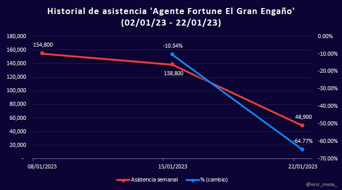 Respecto a asistencia, la película con el peor índice de cambio en asistencia es igualmente para Agente Fortune: El Gran Engaño, con un -64.77% de público.