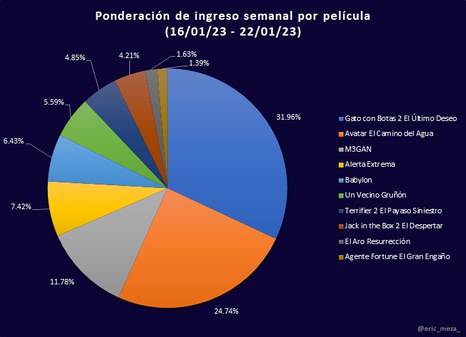 A cinco semanas de su estreno, El Gato Con Botas 2: El último deseo llega al primer lugar en taquilla, desbancando a Avatar: El Camino del Agua. El ingreso de la nueva dominante fue de $64 millones 600,000, cifra que representa el 31.96% del total del top 10.
