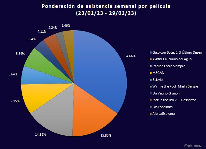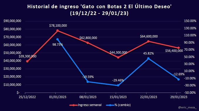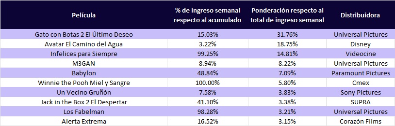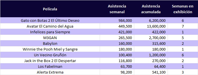 Gato con Botas: el último deseo obtuvo nuevamente el primer lugar en taquilla. El ingreso fue de $56 millones 400,000, correspondiente al 31.76% del total del top 10. La película de DreamWorks sigue posicionándose en primer lugar con un decremento poco significativo considerando que es su sexta semana.