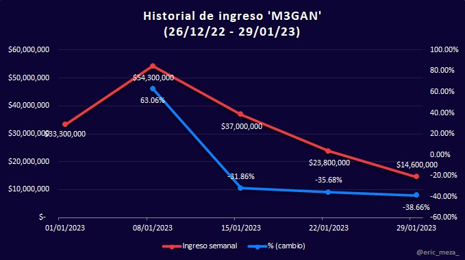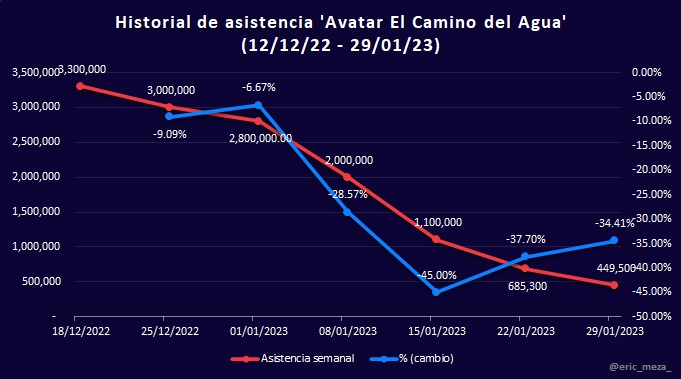 Esta semana disminuyó el ingreso en taquilla respecto a la anterior, regresando a los números con los que comenzó diciembre, antes del estreno de Avatar: el camino del agua. También se suma la caída en taquilla de todas las películas del top y la escasez de estrenos de alto perfil.