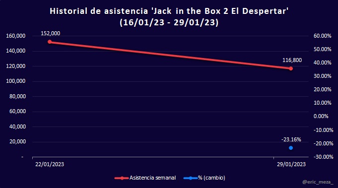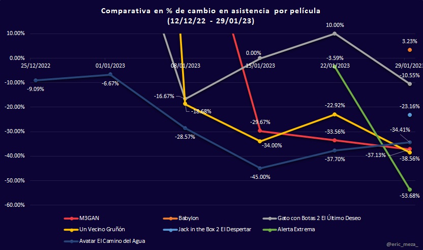 Por último, se muestran las gráficas comparativas en porcentaje de cambio en ingreso y asistencia por película correspondiente al período 23/12/22 – 29/01/23. Todas las películas con más de dos semanas de exhibición tuvieron un porcentaje de cambio negativo en taquilla, siendo la peor semana en lo que llevamos del año; como ya lo mencioné en anteriores semanas, la taquilla seguirá decreciendo hasta el estreno de Ant-Man and The Wasp: Quantumania.