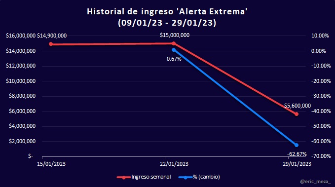 El peor índice de cambio en taquilla del listado es para Alerta Extrema, con un -62.67% de recaudación. Respecto a asistencia, la película con el peor índice de cambio es igualmente para Alerta Extrema, con un -53.68%.