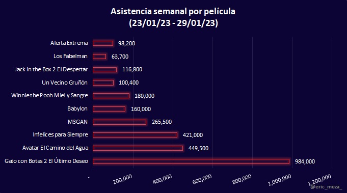 En asistencia tenemos en primer lugar igualmente a Gato con Botas: el último deseo, con 984,000 asistentes, cifra que representa el 34.66% del top 10. En el otro extremo del listado está Los Fabelman, la nueva película de Steven Spielberg, que registró 63,700 asistentes, el 2.24% del listado.