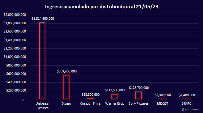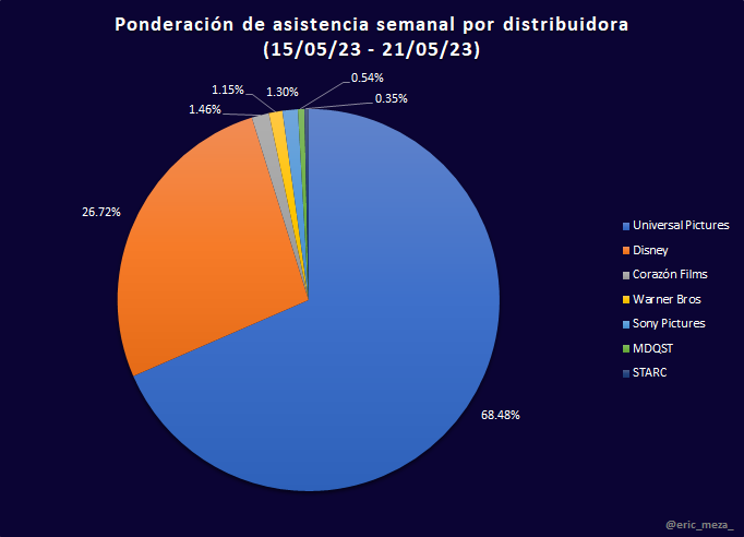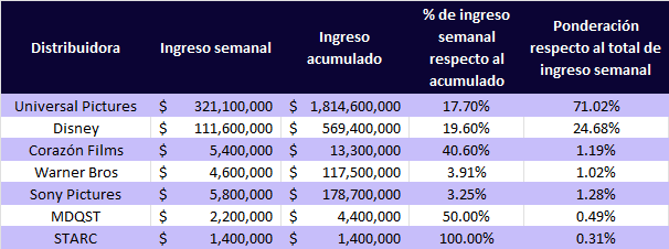 En distribuidoras esta semana resaltan siete. En taquilla tenemos en primer lugar a Universal Pictures con ingresos de $321 millones 100,000 el 71.02% del total del top 10. Y en último lugar está STARC con $1 millón 400,000.
