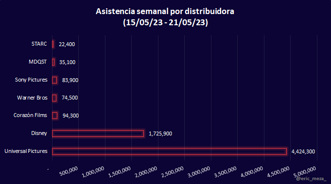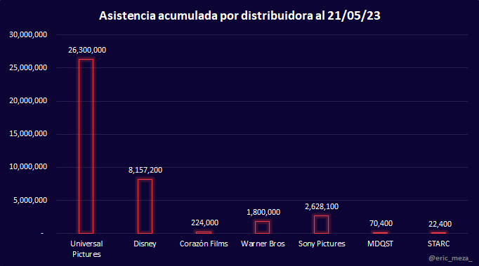 En asistencia tenemos en primer lugar igualmente a Universal Pictures con 4 millones 424,300 asistentes, correspondiente al 68.48% del total del top. Y en último lugar se ubica STARC con 22,400 asistentes.