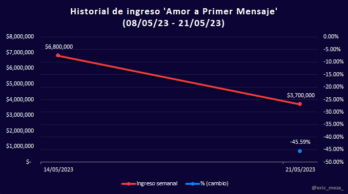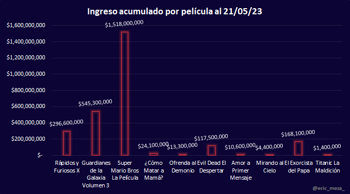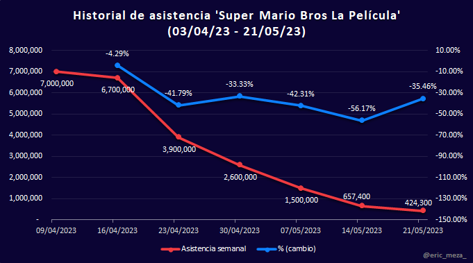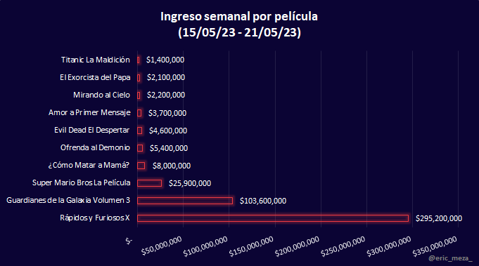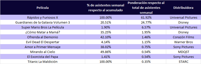 Esta semana la taquilla tuvo un alza respecto a la anterior, derivado del estreno de Rápidos y Furiosos X y la permanencia de películas de alto perfil como Guardianes de la Galaxia Volumen 3 y Super Mario Bros La Película. Además, si bien los porcentajes de cambio siguen siendo negativos, la mayoría de las películas con más de dos semanas en cartelera tiene una pendiente positiva. Esta semana el ingreso de taquilla del top 10 fue de $452 millones 100,000 y la semana anterior fue de $292 millones 300,000, la semana más cercana a lo recaudado al reciente lapso fue el 10 de abril, es decir, una semana después del estreno de Super Mario Bros La Película.