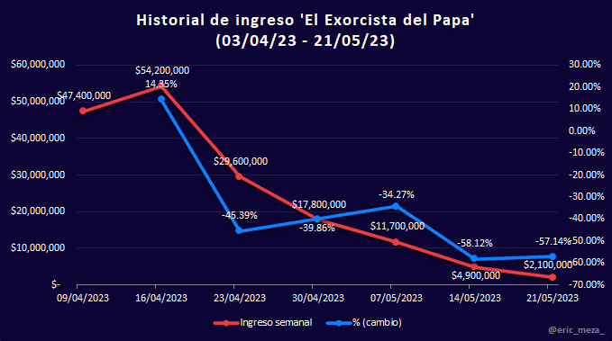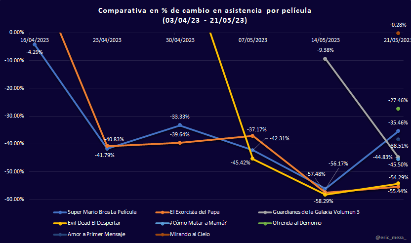 El peor porcentaje de cambio en taquilla del top 10 es para El Exorcista del Papa con un -57.14%, índice esperado para su sorpresiva séptima semana. Es importante señalar que la película ha conservado su lugar en el top 10, a pesar de estrenos de alto perfil como Super Mario Bros La Película, Guardianes de la Galaxia Volumen 3 y Rápidos y Furiosos X.