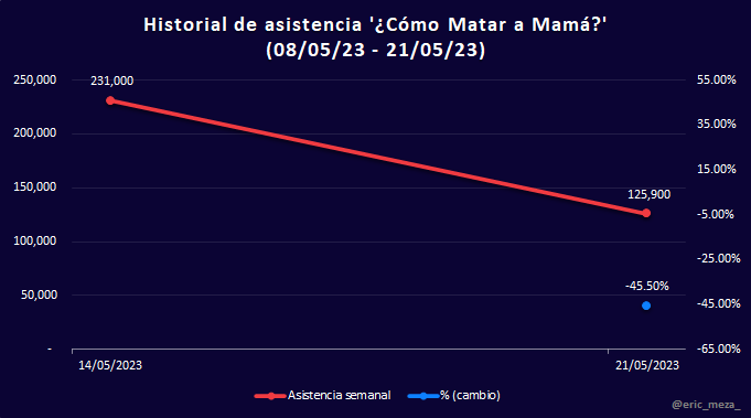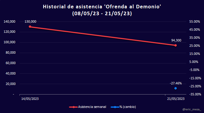 Por último, se muestran las gráficas comparativas en porcentaje de cambio en ingreso y asistencia por película correspondiente al período 03/04/23 – 21/05/23. Esta semana, como ya se mencionó, aumentó significativamente la taquilla y asistencia, y muy seguramente las siguientes dos semanas conservará la taquilla o incluso aumentará, consecuencia de dos estrenos de alto perfil: La sirenita y Spider-Man: A través del Spider-Verso.