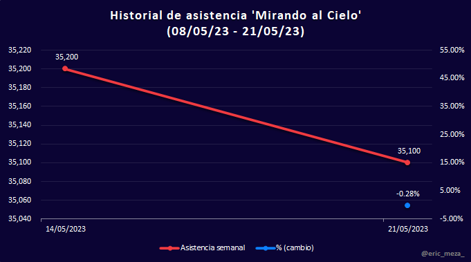 En asistencia, Mirando al Cielo tuvo igualmente el mejor porcentaje de cambio, un índice de -0.28%. Observemos que el porcentaje de cambio es muy cercano a cero, lo cual significa que estuvo muy por debajo que la semana anterior (la diferencia fue de 100 personas).