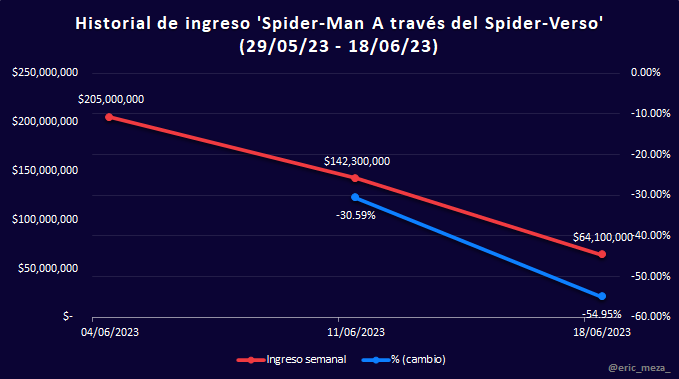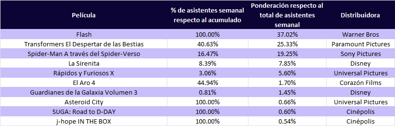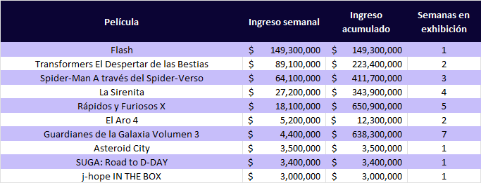 Esta semana aparecieron cuatro estrenos en el top: Flash, Asteroid City, SUGA: Road to D-DAY y j-hope IN THE BOX, en primero, octavo, noveno y décimo lugar, respectivamente. Es importante mencionar que la nueva película de Wes Anderson estrenó con 126 pantallas, recaudando $3 millones 500,000 y una asistencia de 33,900; esto confirma que, si bien es un director pop dentro de la cultura cinematográfica, continúa siendo de nicho.