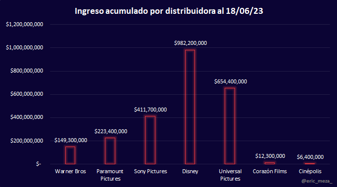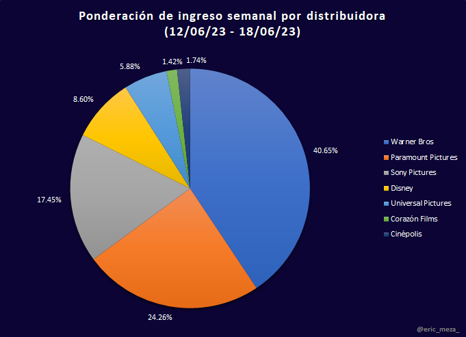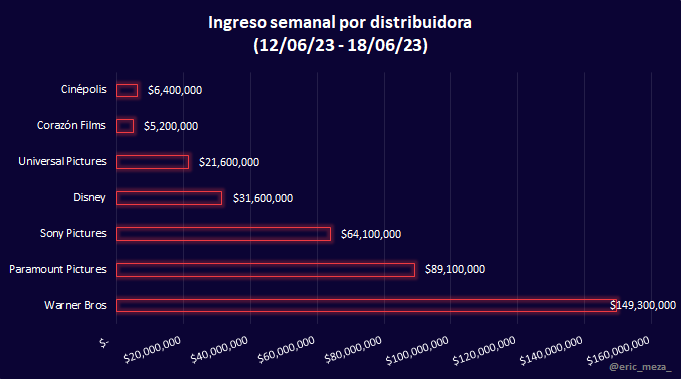 En distribuidoras resaltaron siete. En taquilla tenemos en primer lugar por segunda semana consecutiva a Warner Bros con una recaudación de $149 millones 300,000, el 40.65% del total del top. Contrariamente, en el último sitió se ubicó Cinépolis con $6 millones 400,000, el 1.74% del total del listado.