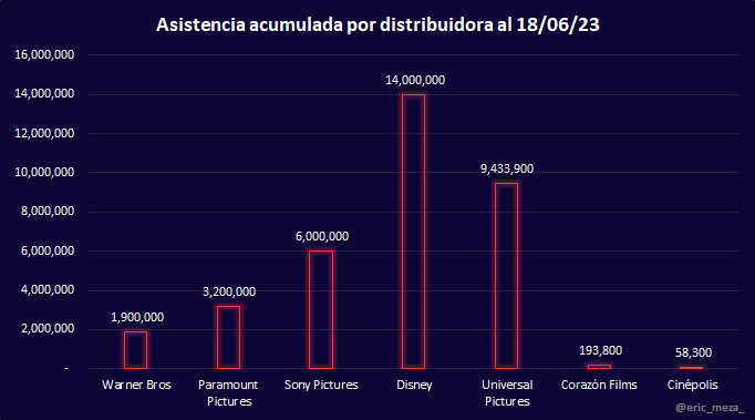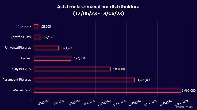 En asistencia igualmente figuró en primer lugar Warner Bros con 1 millón 900,000 asistentes, el 37.02% del total del top, y en último lugar también está Cinépolis con 58,300 asistentes.