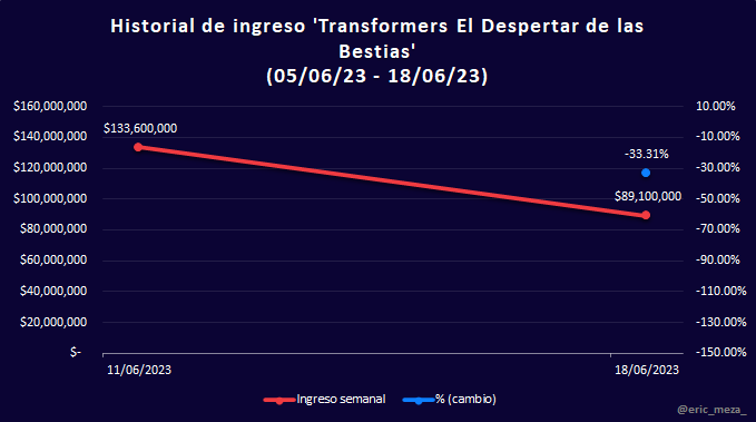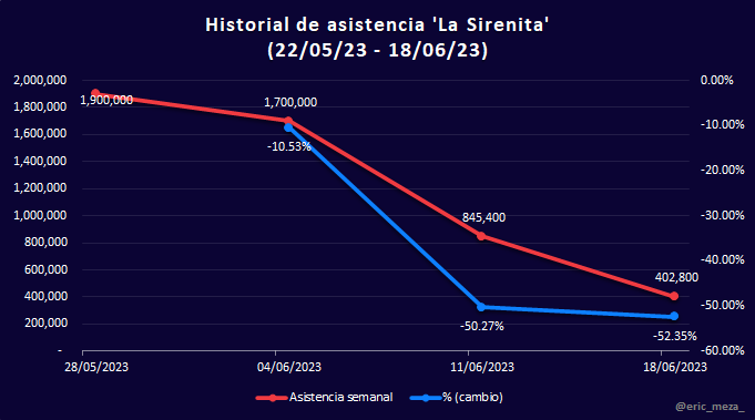 La taquilla disminuyó 10.08% respecto a la semana anterior, debido a los porcentajes de cambio negativos en recaudación y asistencia de la mayoría de las películas del top. Además, sólo hubo un estreno de alto perfil: Flash, con una recaudación por debajo de la media en el cine de superhéroes.