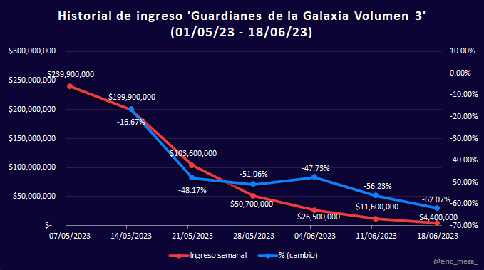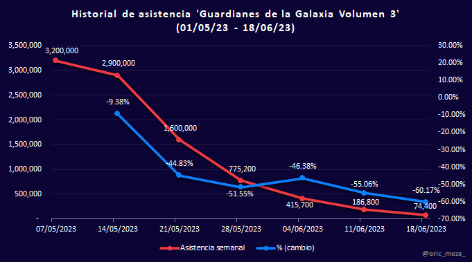 Con -62.07%, Guardianes de la Galaxia Volumen 3 registró el peor porcentaje de cambio en taquilla del top 10, un indice esperado en su séptima semana. La misma película tuvo el peor índice de cambio en asistencia del top 10, un -60.17%. Posiblemente la siguiente semana saldrá del listado.