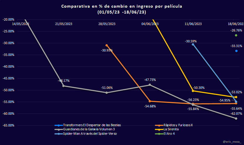 Por último, se muestran las gráficas comparativas en porcentaje de cambio en ingreso y asistencia por película correspondiente al período 01/05/23 – 18/06/23.