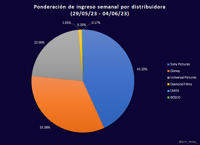Cabe destacar que esta semana tres distribuidoras se quedaron con el 98.58% de la taquilla del top 10: Sony Pictures, Disney y Universal Pictures. En asistencia pasó algo muy parecido, ya que las dichas compañías se quedaron con el 98.33% de asistentes.