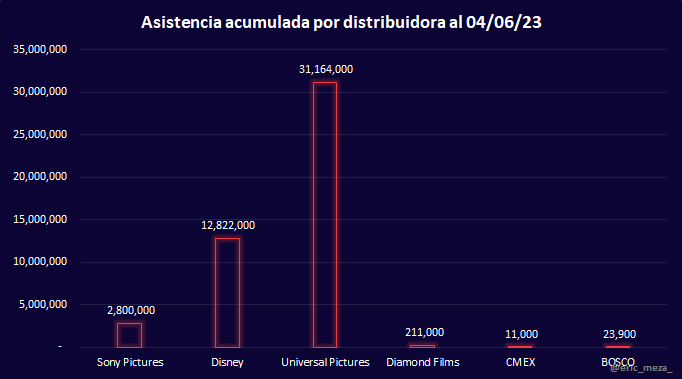 En asistencia tenemos en primer lugar igualmente a Sony Pictures con 2 millones 800,000 asistentes, el 41.06% del top 10. Y en último lugar se ubica CMEX con 11,000.