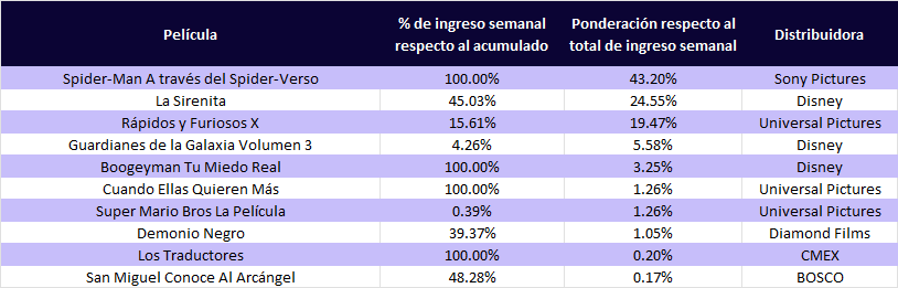 En este lapso solamente aparecieron cuatro estrenos en el top: Spider-Man A través del Spider-Verso, Boogeyman Tu Miedo Real, Cuando Ellas Quieren Más y Los Traductores, en primero, quinto, sexto y noveno lugar, respectivamente.