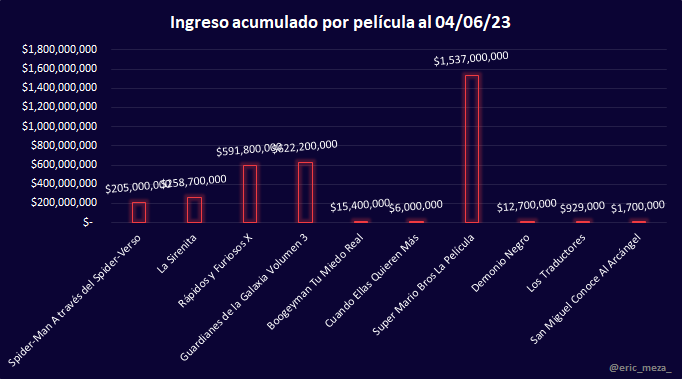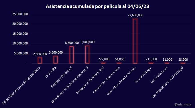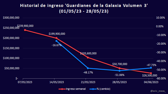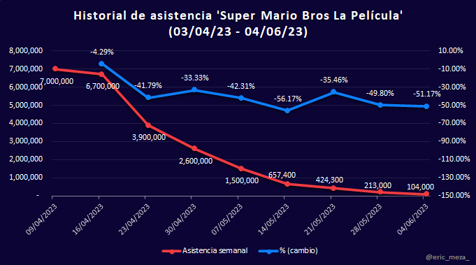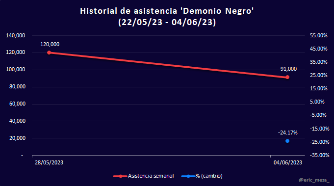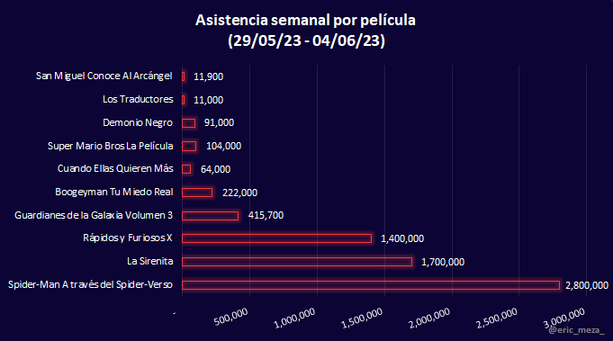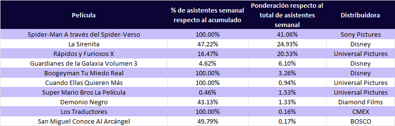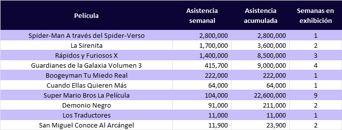 Esta semana, como ya se mencionó, disminuyó la taquilla y asistencia, pero muy seguramente aumentará por el estreno de Transformers: El despertar de las bestias y Flash, además de la recaudación que Spider-Man A través del Spider-Verso en segunda y tercera semana.