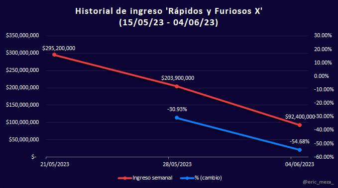 Contrariamente, Rápidos y Furiosos X tuvo el peor índice de cambio en taquilla del top 10: un índice negativo de -54.68%. Se trata de un rendimiento por debajo de lo esperado para ser su tercera semana.