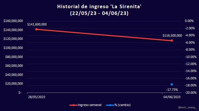 La Sirenita registró el mejor índice de todas las películas del top 10, un cambio negativo del -17.73%. Considerando que es su segunda semana de exhibición, ha tenido un buen rendimiento; de hecho, esta se posicionó arriba de Rápidos y Furiosos X, película que estaba en segundo lugar la semana anterior.