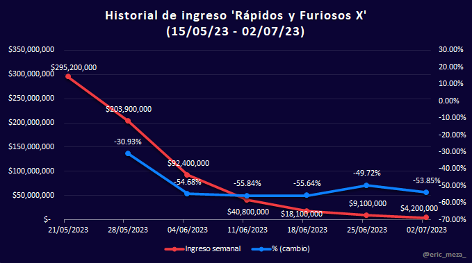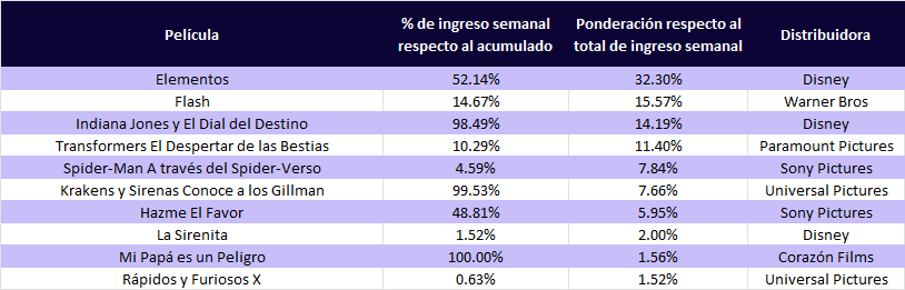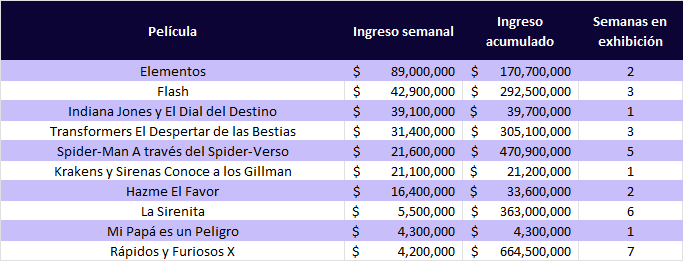 Los ingresos del top 10 disminuyeron un 11.64% con respecto a la semana anterior, consecuencia de porcentajes de cambio negativos en la mayoría de las películas. Adicionalmente, esta semana tuvimos un estreno de alto perfil: Indiana Jones 5, cuya recepción fue pésima al recaudar 39 millones 100, 000 con 1936 pantallas. De hecho, Elementos (en su segunda semana) y Flash (en su tercera semana) tuvieron mejores ingresos.
