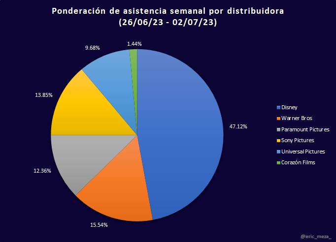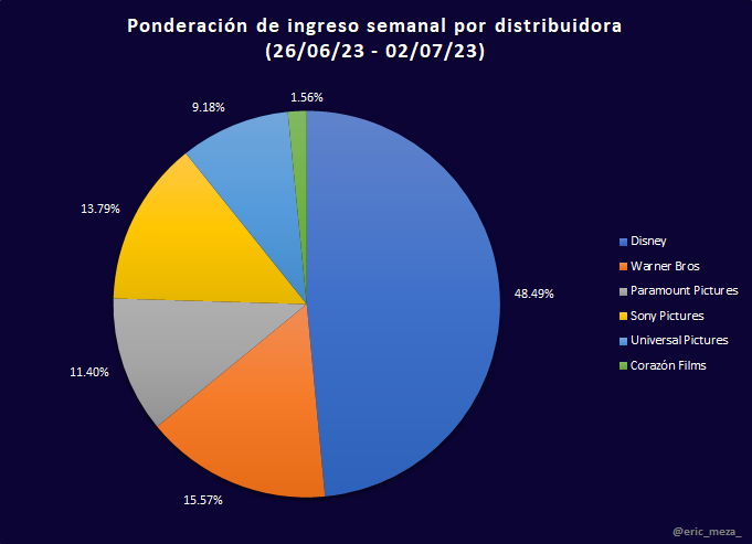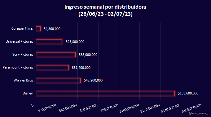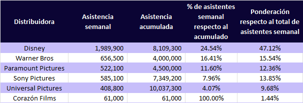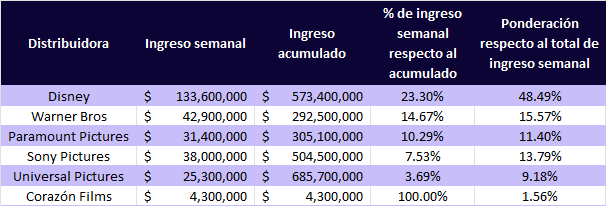 En distribuidoras esta semana resaltan seis. La recaudación la lidera Disney con tres películas y $133 millones 600,000 de ingresos, el 48.49% del top 10. Y en último lugar tenemos a Corazón Films con el 1.56% de la recaudación del top 10.