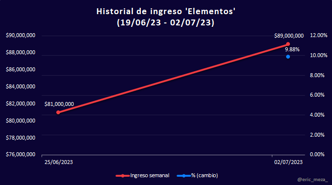 Con un ingreso de $89 millones y 680 pantallas menos que la semana anterior (de 3030 se fue a 2350), Elementos obtuvo el primer lugar en taquilla en su segunda semana. La cifra representó el 32.30% del total del top 10. Contrariamente, la producción con menos ingresos del top fue Rápidos y Furiosos X en su séptima semana.