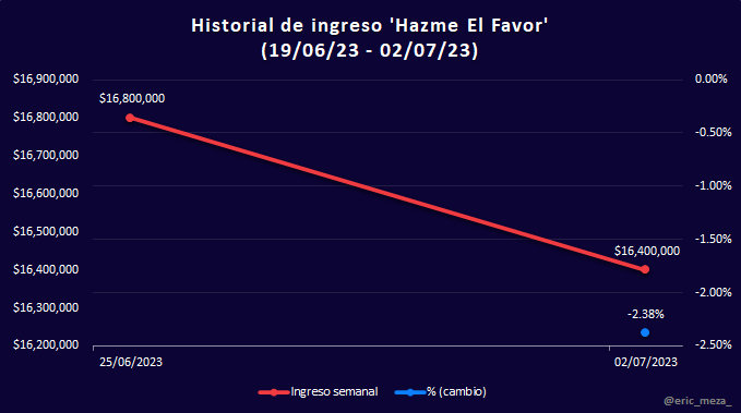 Esta semana, como ya se mencionó, disminuyó la taquilla y asistencia, consecuencia de los bajos porcentajes de cambio y el pésimo recibimiento de la película Indiana Jones y El Dial del Destino, algo que ocurre con cada vez más frecuencia por la superposición de estrenos de alto perfil.
