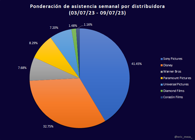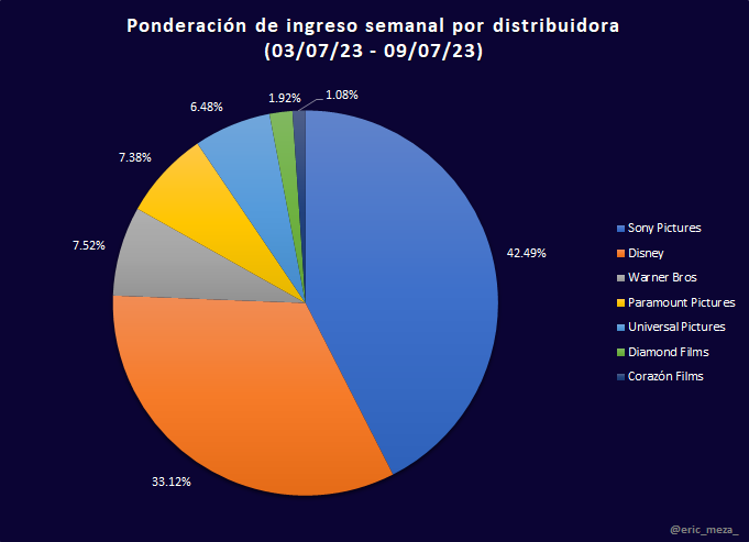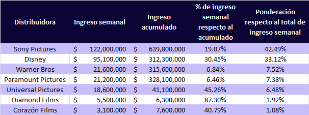 Esta semana resaltan siete distribuidoras. En cuanto a recaudación se ubica en primer lugar Sony Pictures con una recaudación de $122 millones, cifra que representa el 42.49 % de los ingresos del top. En último lugar del listado se ubica, por segunda semana consecutiva, a Corazón Films con $3 millones 100,000.