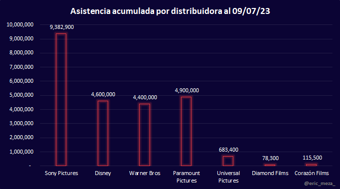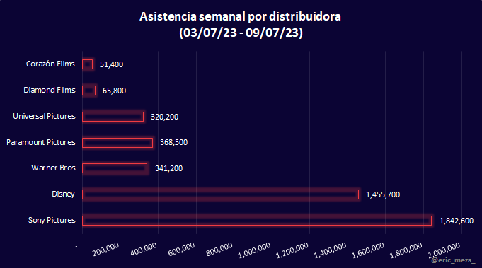 En asistencia tenemos en primer lugar igualmente a Sony Pictures con 1 millón 842,600 asistentes, el 41.45 % del total del listado. Al igual que en ingresos, en último lugar está Corazón Films con 51,400 asistentes.