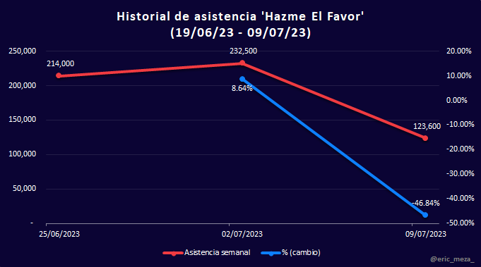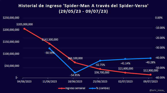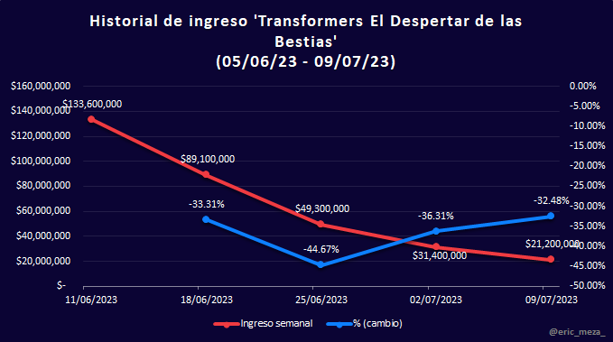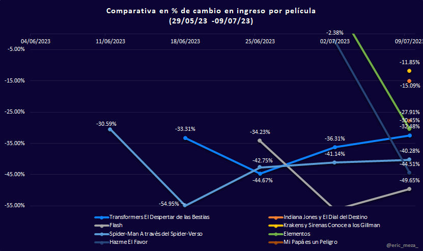 Por último, se muestran las gráficas comparativas en porcentaje de cambio en ingreso y asistencia por película correspondiente al período 29/05/23 – 09/07/23.