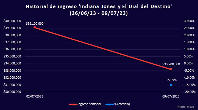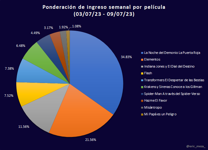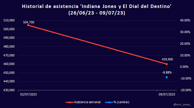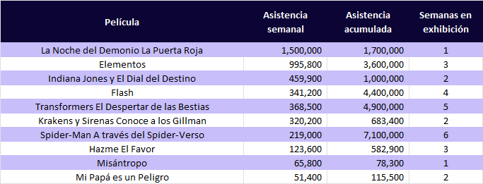 Cabe destacar que, con 1251 pantallas (685 menos que la semana anterior) Indiana Jones y El Dial del Destino se mantuvo en tercer lugar, mientras que el resto del top descendió, consecuencia del estreno de La Noche del Demonio: La Puerta Roja.