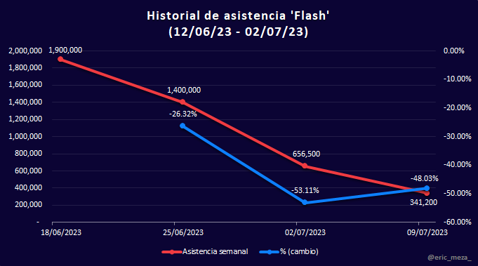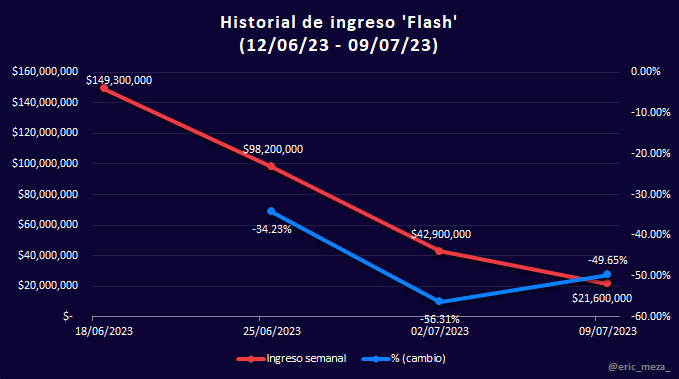 En su cuarta semana de exhibición Flash tuvo el peor porcentaje de cambio en ingresos del top 10, un -49.65%, cifra esperada considerando que es su cuarta semana. La misma película registró el peor índice de cambio en asistencia, un -48.03%.